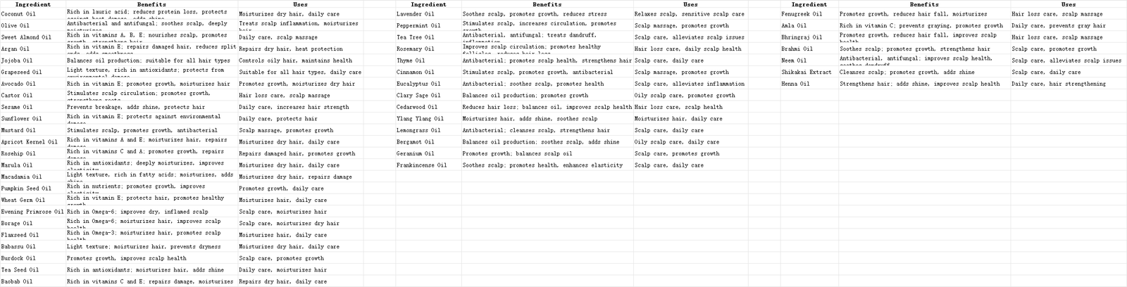 Carrier oils form the foundation of hair oil, providing moisture and nourishment. They are suitable for various hair types and are often the primary ingredient in formulations.