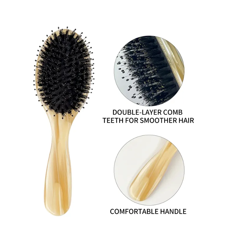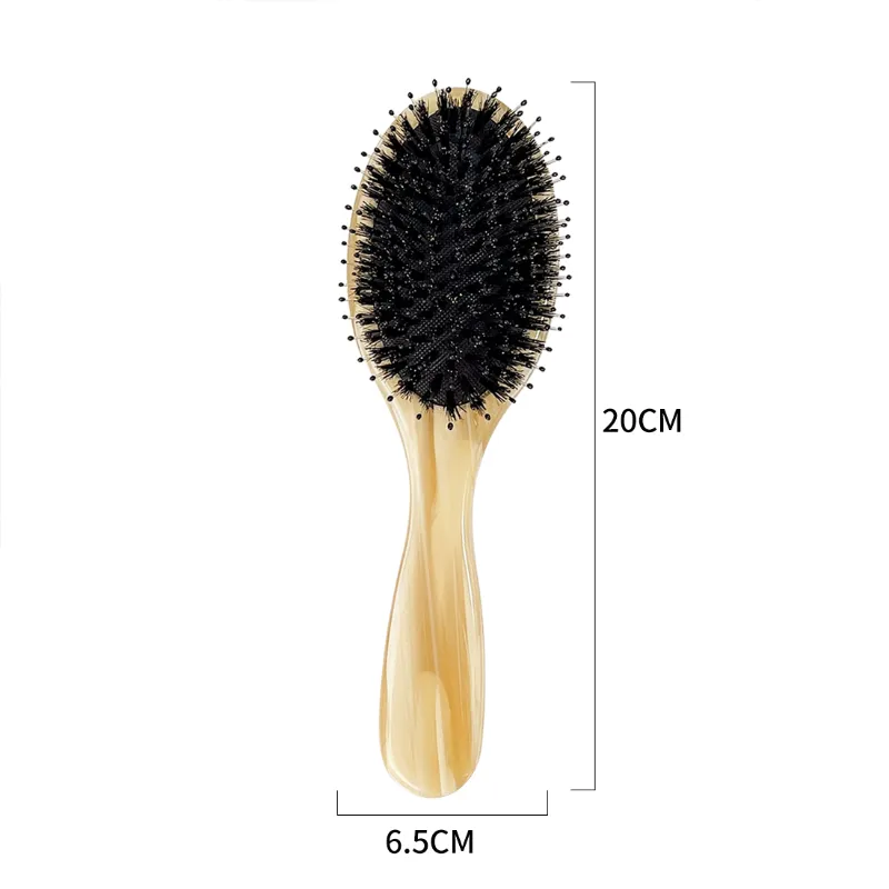Elevate your hair care routine with the Acetate Oval Hair Brush with Rubber Cushion. Featuring a durable acetate body, a gentle rubber cushion, and a premium blend of nylon and boar bristle brush hairs, this elliptical brush offers smooth detangling and scalp stimulation for all hair types. Its ergonomic design and high-quality materials make it perfect for daily styling and maintaining healthy, shiny hair.