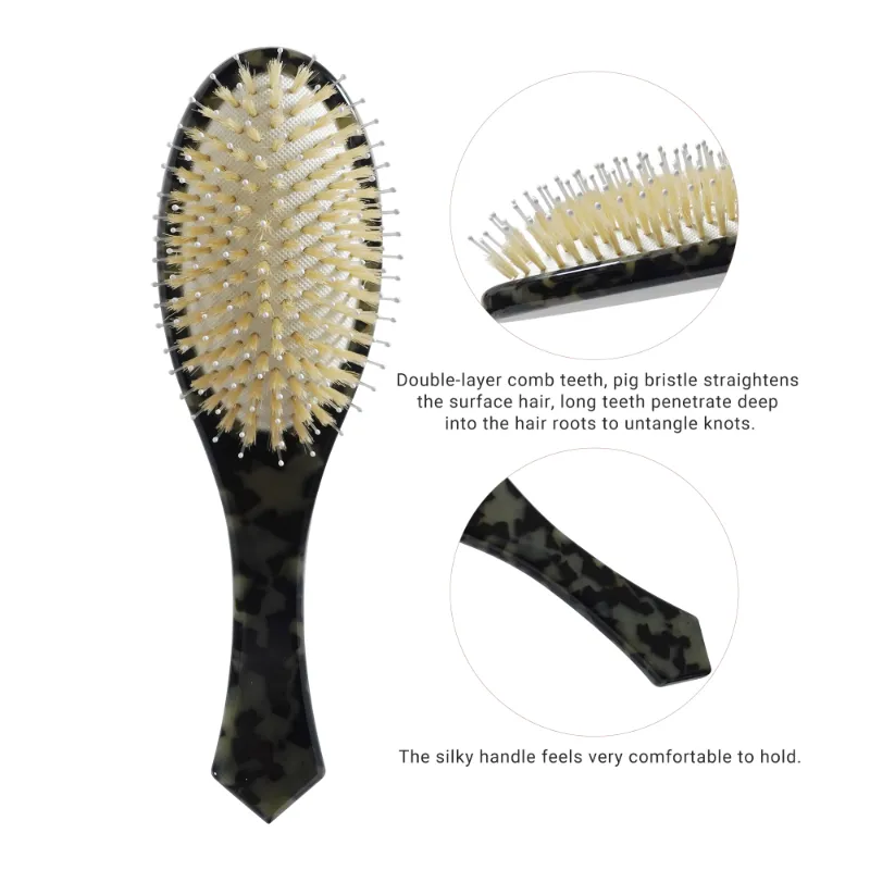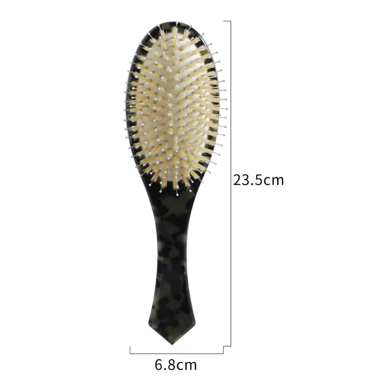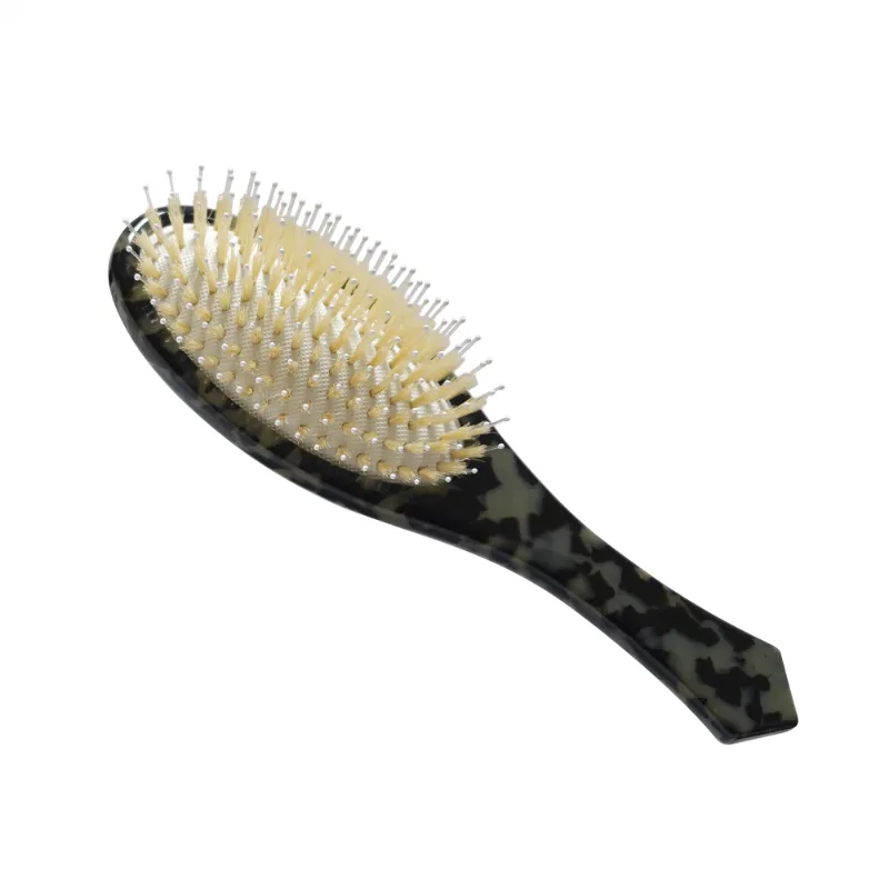 Transform your hair care routine with the Black Marble Texture Acetate Paddle Hair Brush with Diamond Grip, a luxurious blend of style and functionality. Featuring a striking black marble-textured acetate body with an elliptical brush head, this brush is complemented by a unique diamond-shaped grip for enhanced control and comfort. It combines fine nylon bristles with epoxy resin-tipped ends and soft boar bristles for gentle detangling, smoothing, and scalp stimulation, suitable for all hair types with a sophisticated, modern aesthetic.