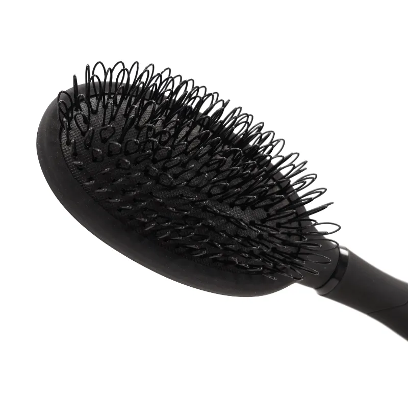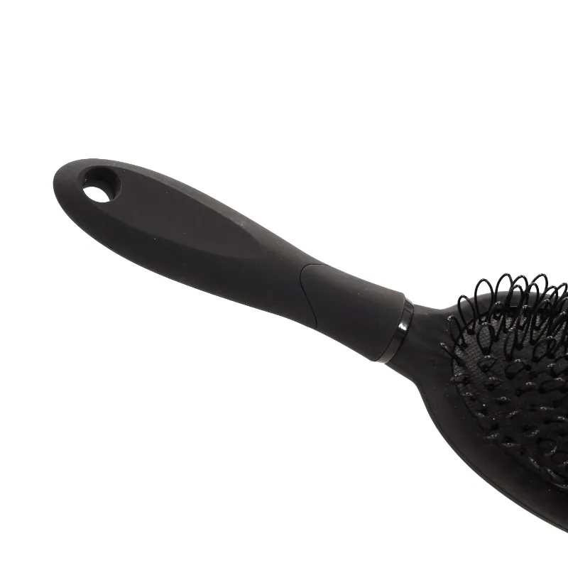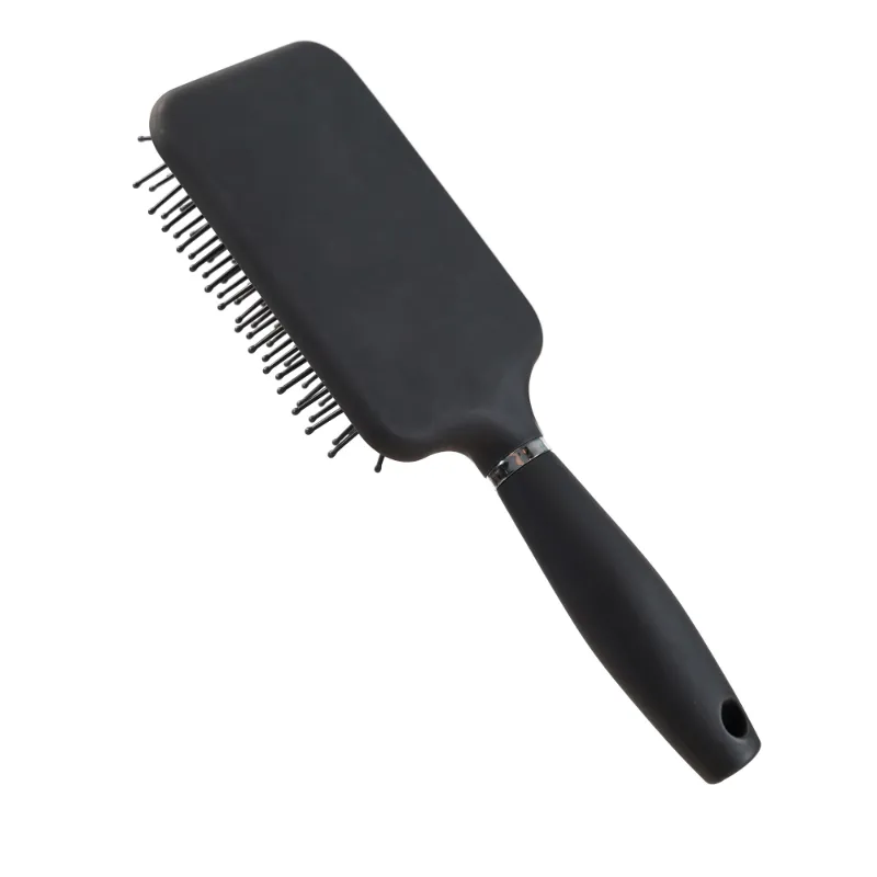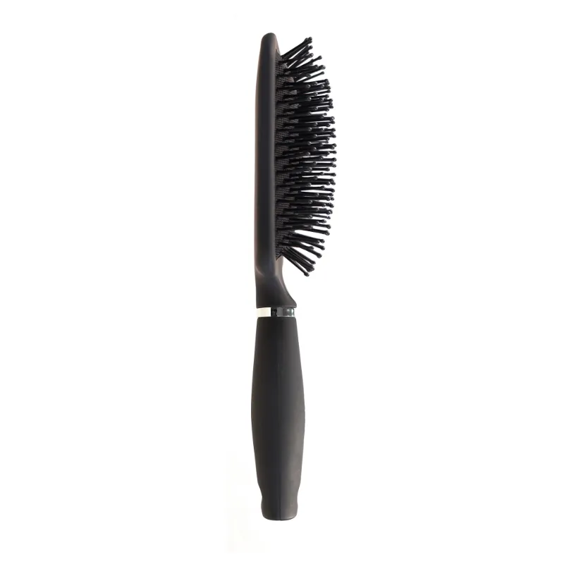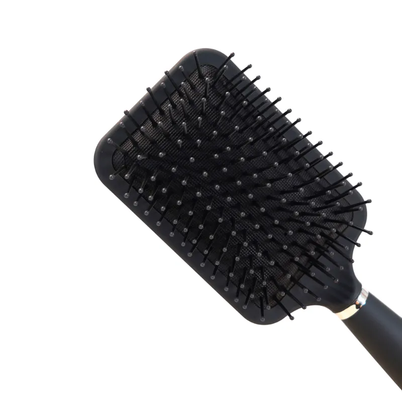 A custom black premium paddle hair brush by JUNYI BEAUTY combines luxury and practicality for an elevated grooming experience. It is constructed with a high quality ABS base and rubber cushion for durability and comfortable grip. Smooth detangling and effortless styling are a feature of the nylon comb teeth and resin epoxy bead heads, making it a versatile choice for all hair types.