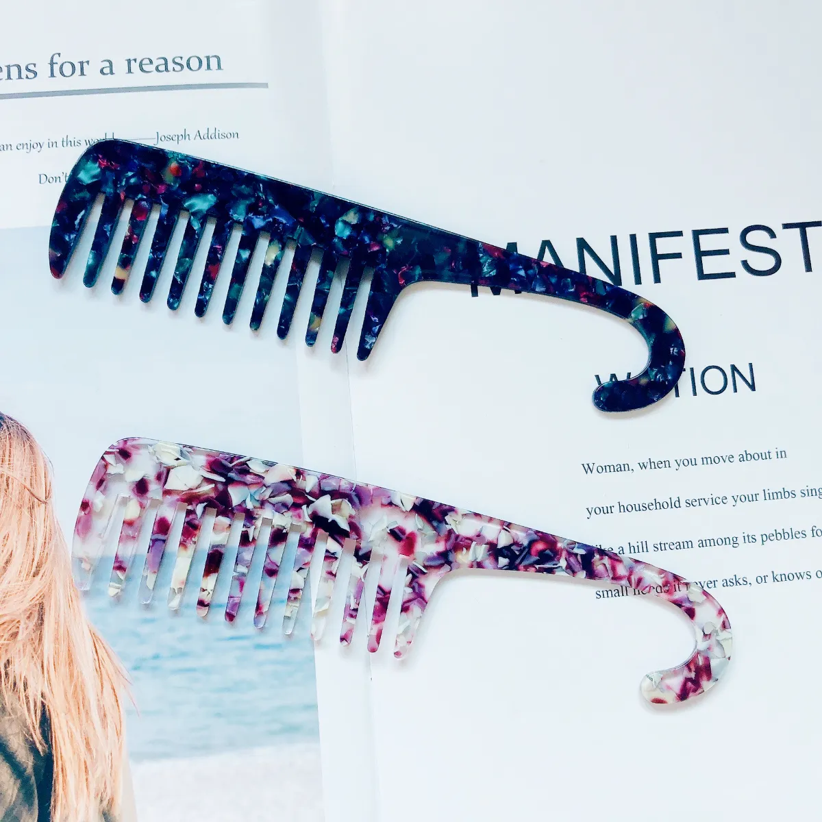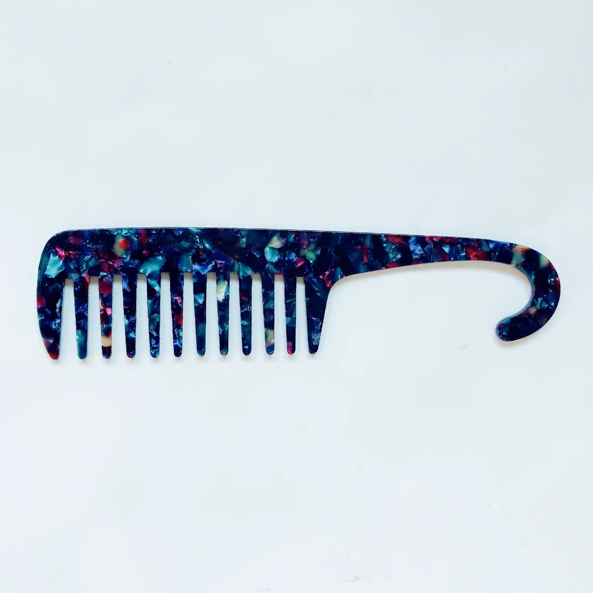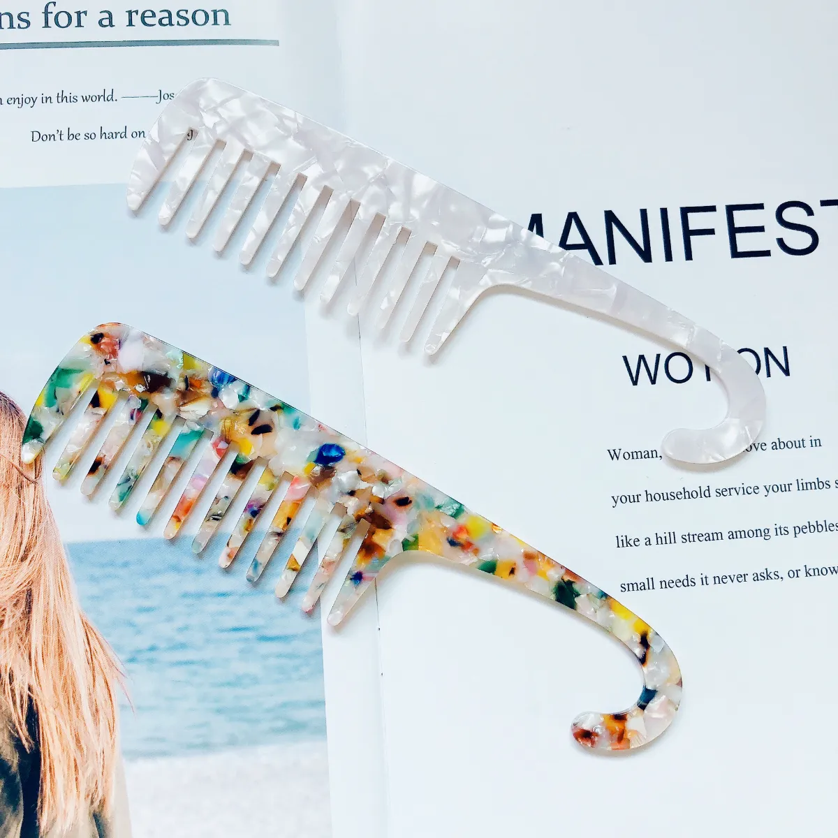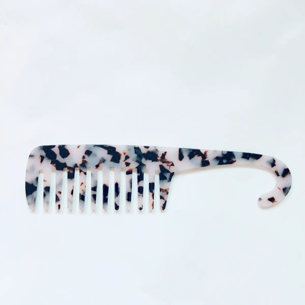 Add a pop of color to your hair care routine with the Customizable Colorful Acetate Wide-Tooth Detangling Comb with Hook for Wet and Dry Hair. Crafted from eco-friendly acetate, this comb boasts vibrant tortoiseshell patterns in shades like blue, pink, and orange. Its wide-tooth design gently detangles wet or dry hair, minimizing breakage for all hair types. The built-in hook at the handle’s end allows for easy storage, while the lightweight build ensures a comfortable grip. Customize the color or add your logo to make it yours!