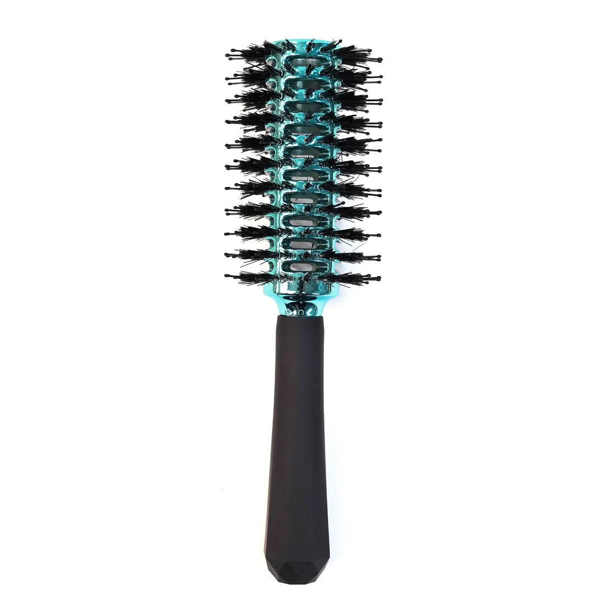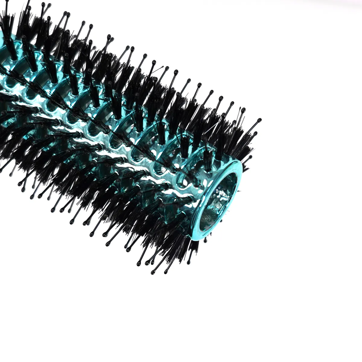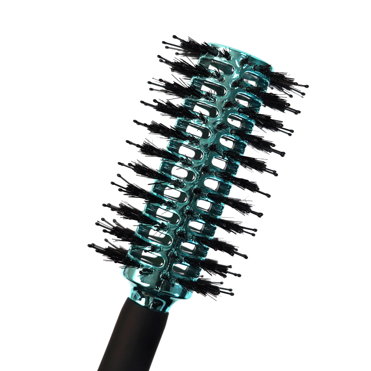 Style with ease using the Electroplated Vented Barrel Round Brush with Mixed Bristles and Ergonomic Handle. Featuring a sleek electroplated turquoise barrel, this brush ensures a premium look while its vented design promotes airflow for faster drying. The mixed bristles gently detangle and smooth hair, making it ideal for all hair types. The ergonomic black handle provides a comfortable, non-slip grip for effortless styling. Customize the barrel color or add your logo to make it yours!