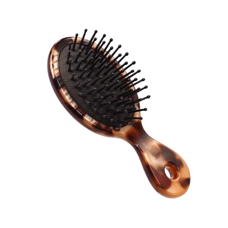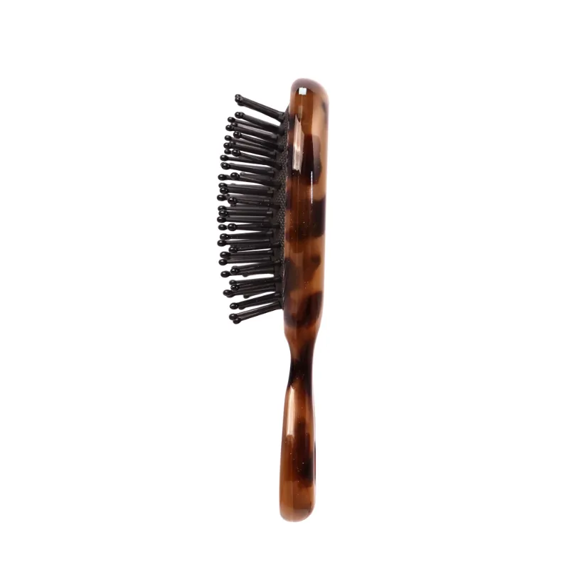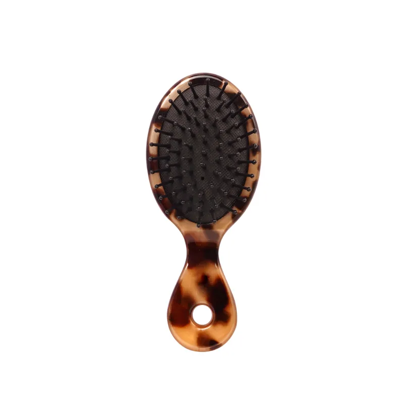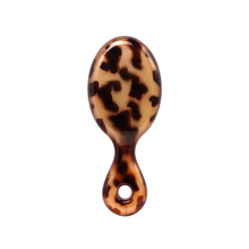 Enhance your on-the-go hair care with the Leopard Print Mini Oval Acetate Hair Brush with Rubber Cushion. This compact, portable brush features a stylish leopard print elliptical acetate body, a soft rubber cushion for gentle scalp massage, and durable nylon wide-tooth bristles for effortless detangling of all hair types. Its integrated handle, designed with a comfortable curve and a triangular hole at the base for easy hanging or grip, ensures convenience and portability. Ideal for travel or daily touch-ups with a touch of bold elegance.