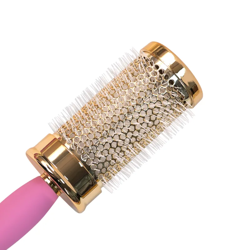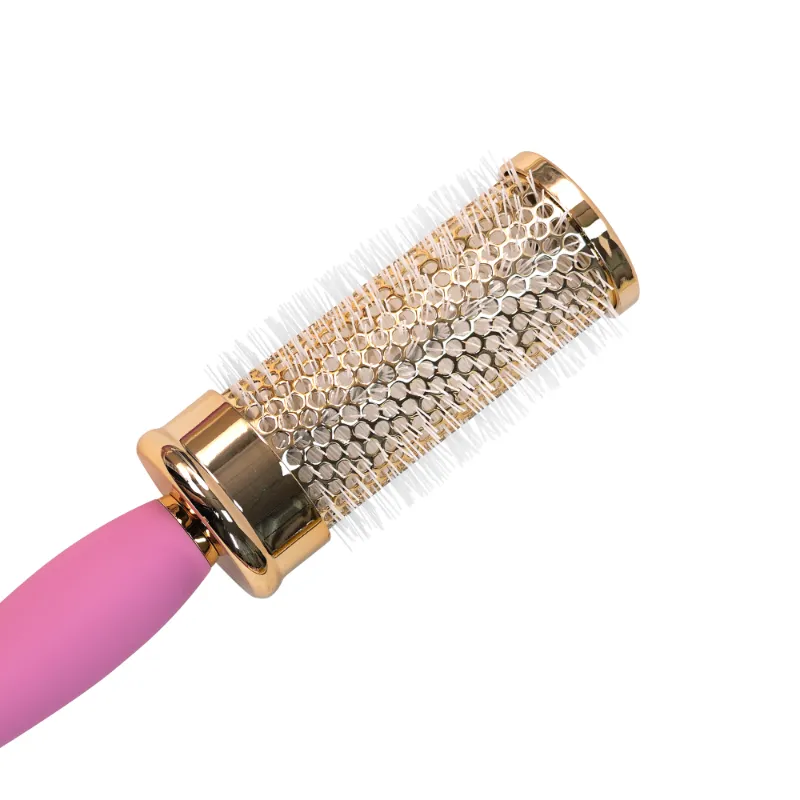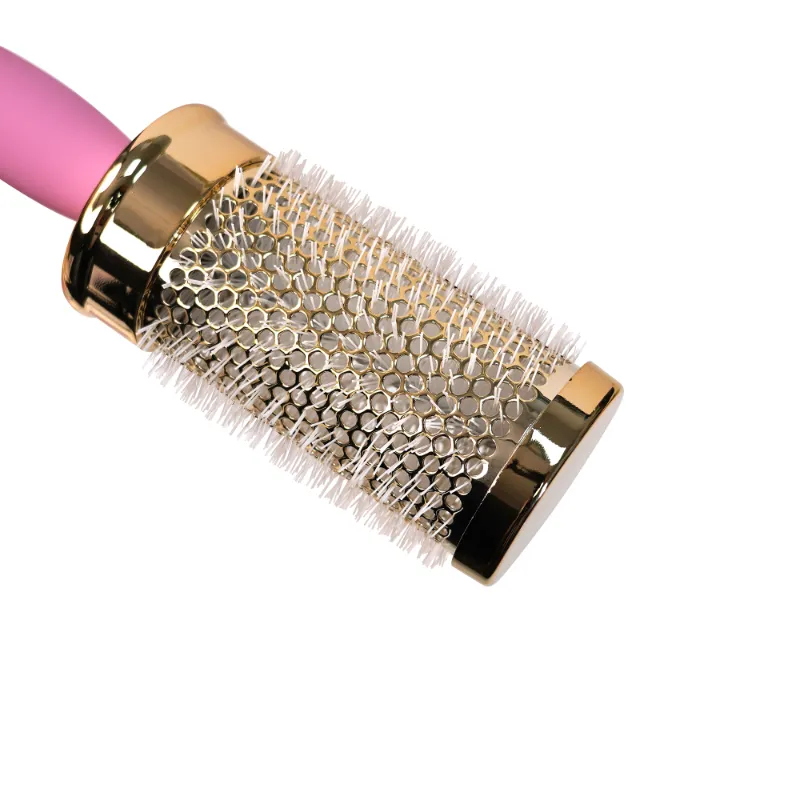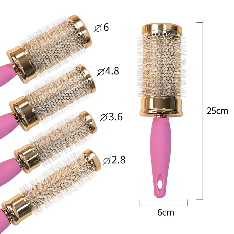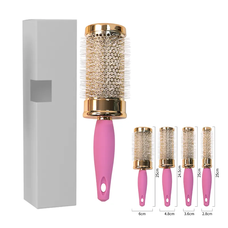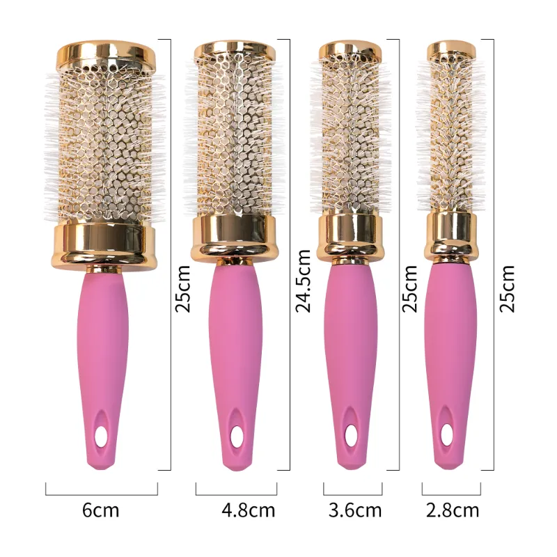Crafted with precision, the Luxury Gold & Pink Round Hair Brush Set features a range of four round brushes with durable bristles that effortlessly style and smooth hair, perfect for creating voluminous blowouts or defined curls. The varying barrel sizes—6 cm, 4.8 cm, 3.6 cm, and 2.8 cm in diameter, each with a 25 cm handle—cater to different styling needs, while the ergonomic pink handle with a hanging hole ensures a comfortable grip. This set is ideal for both professional salon use and at-home styling.