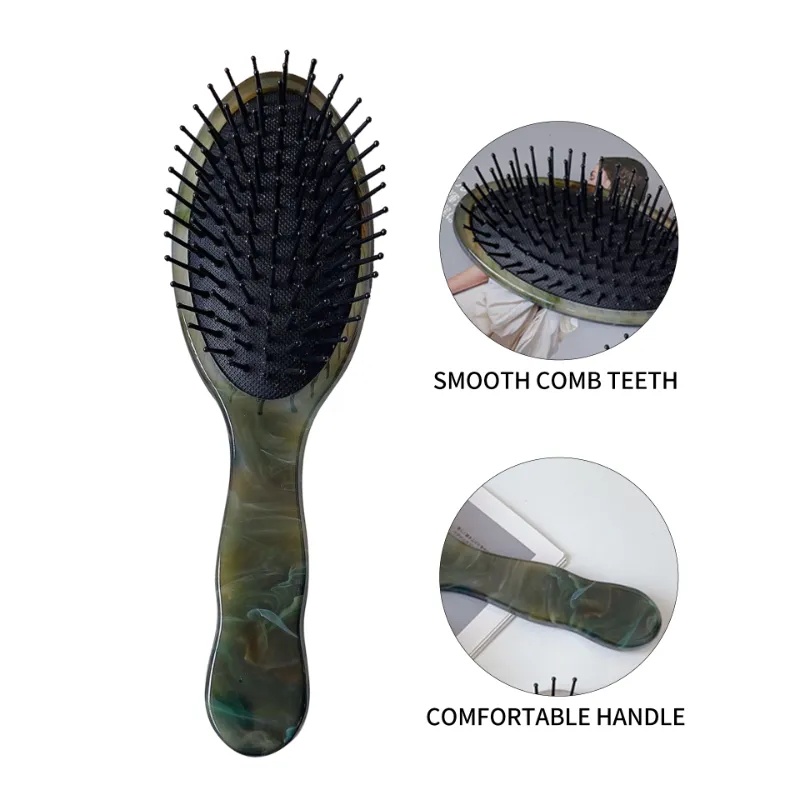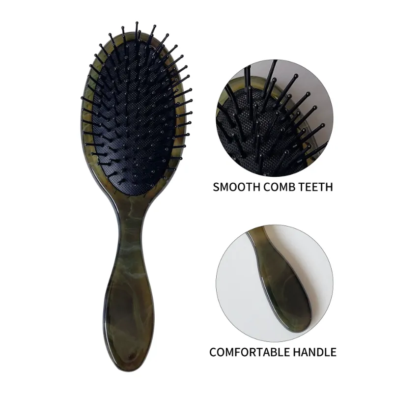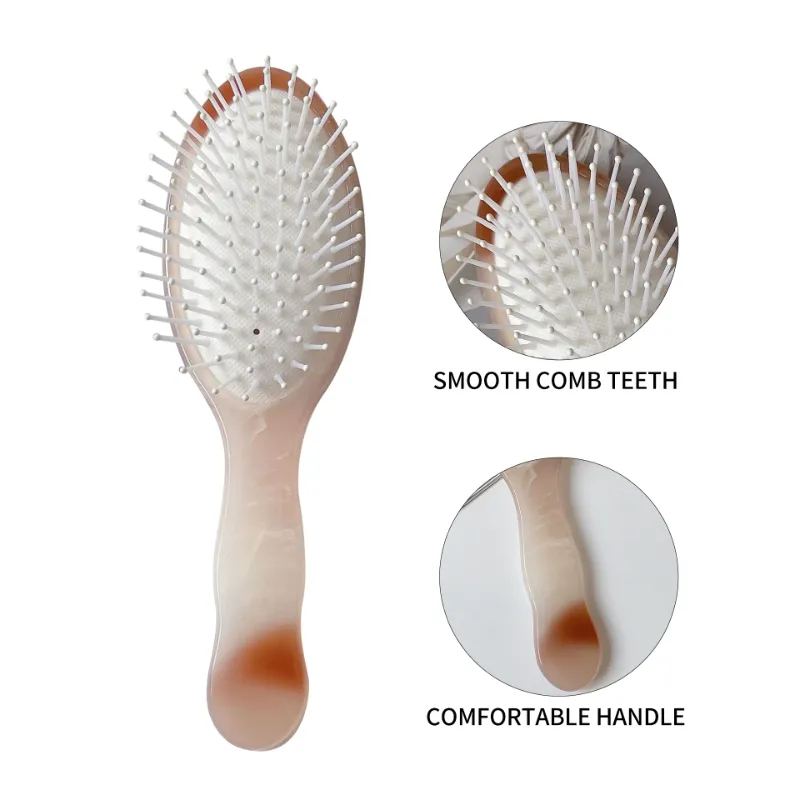Discover the Translucent Acetate Hair Brush with Rubber Cushion, a standout from our premium acetate comb series. Crafted with a sleek, semi-transparent acetate body, this brush features a soft rubber cushion that gently massages the scalp while reducing tension. Equipped with durable nylon wide-tooth bristles, it effortlessly detangles all hair types—straight, wavy, or curly—while minimizing breakage and enhancing shine. The ergonomic, elliptical design fits comfortably in your hand, making it ideal for daily styling at home or on the go. Its modern, translucent finish adds a touch of elegance to any hair care routine.